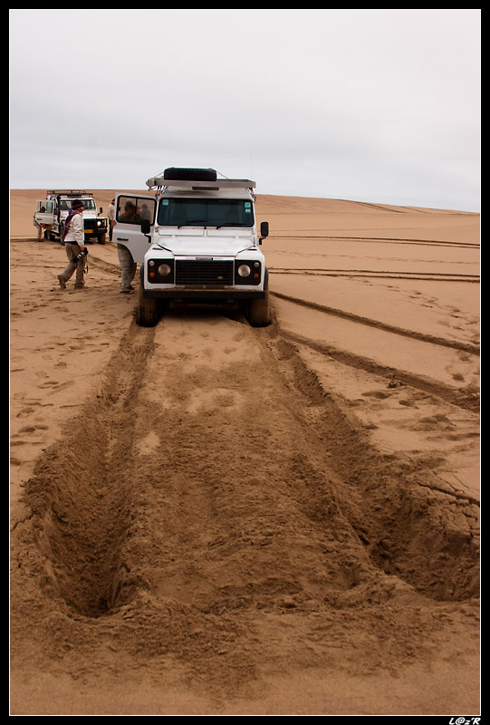 Notre 4x4 s’est ensablé au moment où le conducteur du 4x4 devant nous a tenté de nous prévenir du danger du sable à cet endroit la. Nous aurons besoin de l’aide d’un autre 4x4 pour nous tirer de là à l’aide d’une sangle.