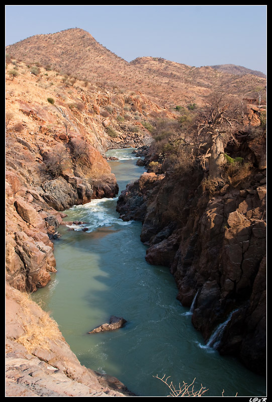 Après un petit déjeuner au bar, puis après avoir rangés les tentes, départ pour une petite randonnée à pied au bord des chutes. Nous ne faisons pas la grand randonnée à la recherche des crocodiles suggérée la veille. Le site est superbe, on regrette tous de ne pas avoir pu faire cette ballade la veille au coucher du soleil, occupés comme nous l’étions à réparer nos roues de secours. Les chutes sont immenses, nous n’en avions en fait qu’un très maigre aperçu du camp. Une femme Himba avec son bébé lave le linge au bord de l’eau. C’est toute cette région qui risque de disparaitre. En effet le gouvernement étudie la construction d'un immense barrage hydroélectrique qui inondera toute cette magnifique région, provoquant la disparitions des Himbas, de la végétation et des animaux.