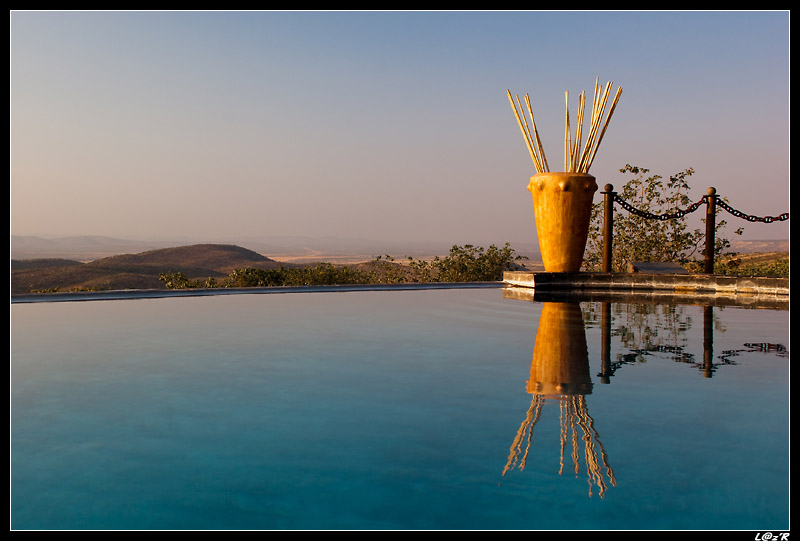 On retourne au Opuwo Country Lodge, mais cette fois coté camping. On a quand même un superbe emplacement avec de la pelouse verte et une superbe vue sur la vallée. On installe nos tentes et on file après un pique-nique au bord de la piscine. Piscine à débordement divine avec une vue plongeante sur la vallée. On fait les fous et des multitudes de photo malgré la froideur de l’eau. On passe un après midi au calme, à siroter des Appletizer, des Cocas et des bières avec des glaces à la vanille et au chocolat noir fondu.