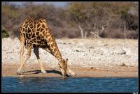 Un peu plus tard à un point d'eau nous découvrons des dizaines de girafes, les jambes écartées pour boire, et l'une d'elle restant toujours à l'affut guettant les alentours. On croise aussi les fameuses pintades bleues de Namibie, ainsi que des vautours beaucoup moins jolis sur un cadavre de petit girafon. Sur le chemin de retour, à notre dernier arrêt à un point d'eau on assiste à notre plus beau spectacle d'Etosha : trois magnifiques petit lionceaux qui jouent et viennent boire l'eau du lac. On essaie en vain d'apercevoir la maman qui ne devrait pas être bien loin, sans succès.