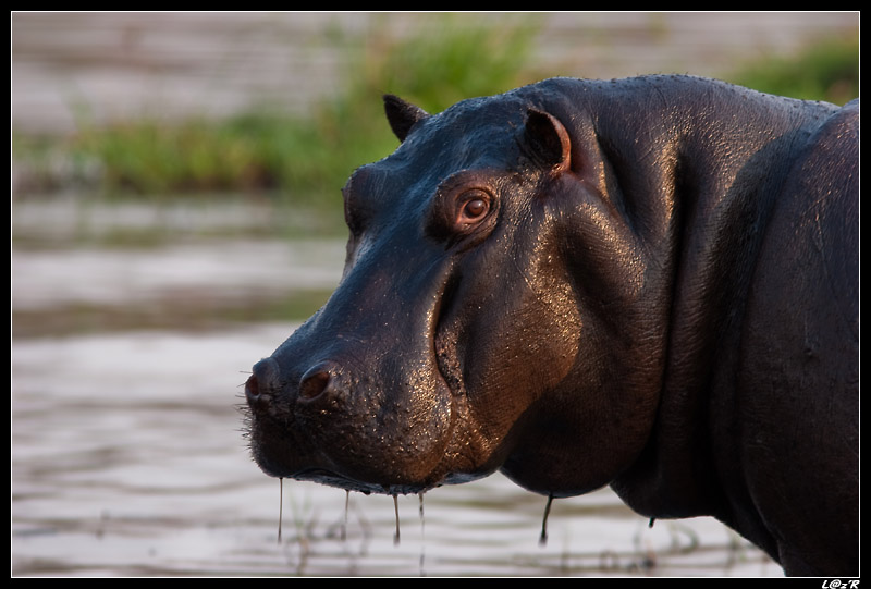 Nous apercevons des crocodiles au bord du fleuve, un groupe d’hippopotames à terre et un autre groupe dans l’eau. A l’horizon au fil de l’eau des têtes apparaissent et disparaissent. Un hippopotame sort de l’eau enfonçant son énorme masse dans la boue.