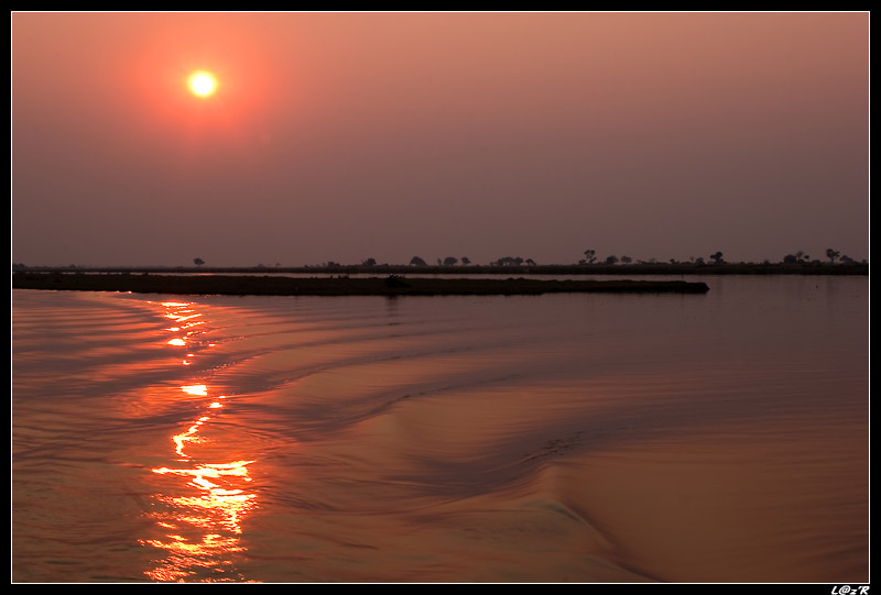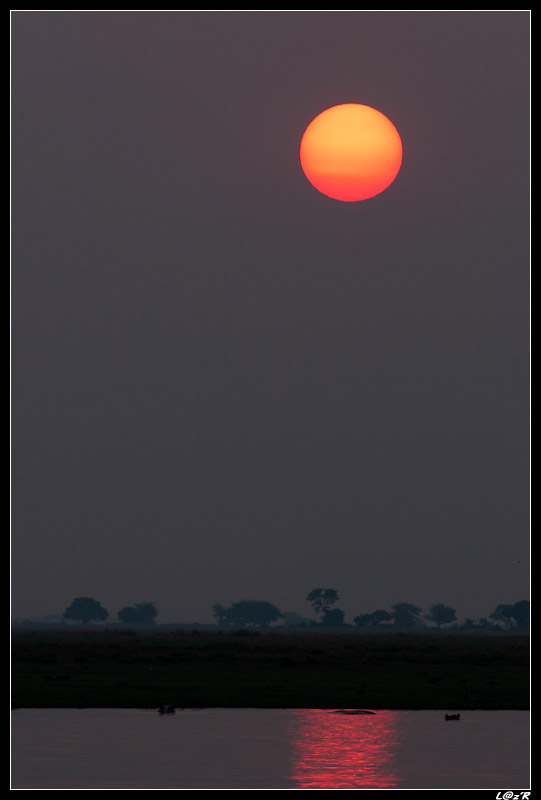 Un groupe d’éléphant traverse le fleuve sous nos yeux. C’est un drôle de spectacle : ils ressortent tous à la queue leu-leu avec la trace du niveau d’eau. Puis on assiste à un très beau coucher de soleil avec des éléphants en fond.