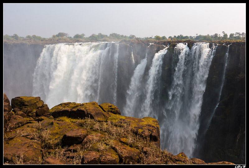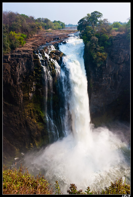 A la sortie, juste à la dernière barrière, un gars s'approche de la voiture et montre le poing à Laurent, essayant probablement de nous alléger de quelques billets. On fait comme si on ne comprend rien, Laurent éclate de rire comme si il prenait cela pour de l'humour, et au final il nous laisse passer la frontière tranquillement.Il n'y a pas beaucoup d’habitations coté Zimbabwe. On croise quand même 4 ou 5 éléphants. Après 80 km on arrive à la ville de Victoria Falls. On se gare près du parc national qui gère les chutes. L'entrée coute 20 dollars. S'en suit une jolie ballade avec différents points de vues, dont une descente de 73 marches. Il brume comme aux chutes de Niagara ! Le fait que le site soit protégé et donc à l’état sauvage lui donne beaucoup plus de charme que Niagara, malgré le fait qu’une partie des chutes soit à sec à cause de la saison sèche. On approche quelques babouins, mais l'un d'eux a crié sur Marie quand elle s'est approchée trop près avec son appareil photo !