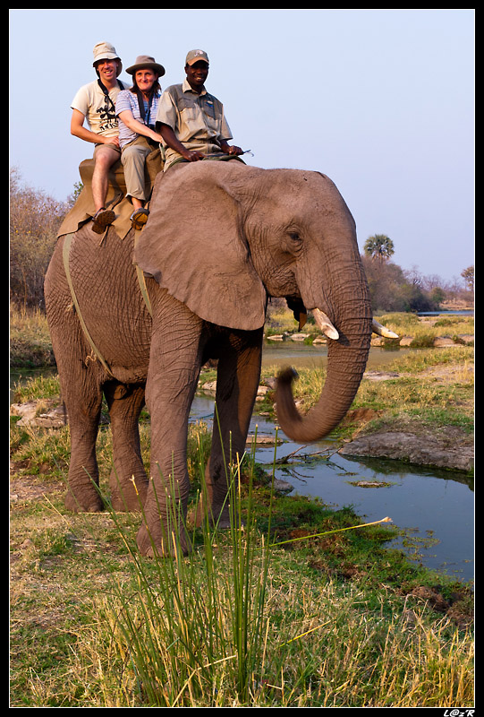 L’hôtel est joli mais assez impersonnel par rapport à tous ce que l’on a déjà vu. Le style architectural tout comme le personnel sont assez froids. On mange et boit un verre près de la piscine. Repas est un grand mot : hamburger pour Fatiha et Christophe et un Platter pour Marie et Laurent. Les portions sont petites et les prix exorbitants ! Pour la dernière heure à tuer avant le safari on squatte les canapés de l’hôtel. Le bus arrive pour nous emmener à la « ferme » à 8 km de Victoria Falls. Arrivés à la ferme, on nous sert d’abord un verre d’accueil, puis après un léger briefing arrivent les éléphants pour d’abord recevoir nos caresses et boire un peu. Marie et Christophe sont les deux premiers à monter. Notre éléphant s’appelle Jack. La ballade est agréable du haut des 2m50 de notre hôte. Notre guide, sur l’éléphant avec nous, est adorable. Il nous fait éviter tous les branchages. On croise des buffles de très près. Ils remarquent à peine notre présence sur le dos de l’éléphant. Des gardes armés accompagnent quand même les éléphants à l’affut. Une maman éléphant qui porte Fatiha et Laurent a même son bébé qui la suit ! Après une heure trente de ballade, on retourne à la ferme où on nourrie nos éléphants à l'aide de grosses granules qu’ils aspirent dans nos mains par leur trompe, avant de les porter à leur bouche.
