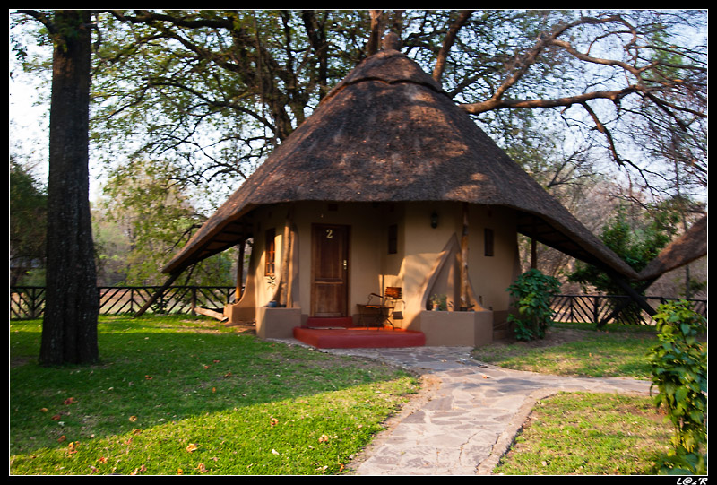 Petit déjeuner au Lodge après un lever tardif. Un charmant chat noir et blanc choisi toujours les pieds de Laurent pour venir se frotter : on l'appelle "copain copain, le retour" ! On découvre le Lodge de jour, qui est au bord du Zambèze. On traine au Lodge et on part très tard après un grand nettoyage du 4*4 et un gonflage de pneu. En effet tous les matins depuis pas mal de temps nous regonflons notre pneu pour la journée. ce matin-là, une famille nous regarde faire et nous propose de changer notre pneu qui est crevé. On leur annonce qu'il n'y a rien de grave et qu'on a l'habitude ! Personne ne comprend notre petit rituel, surtout quand nous leur annonçons qu'on a deux roues de secours. Ils nous prennent tous pour des fous !