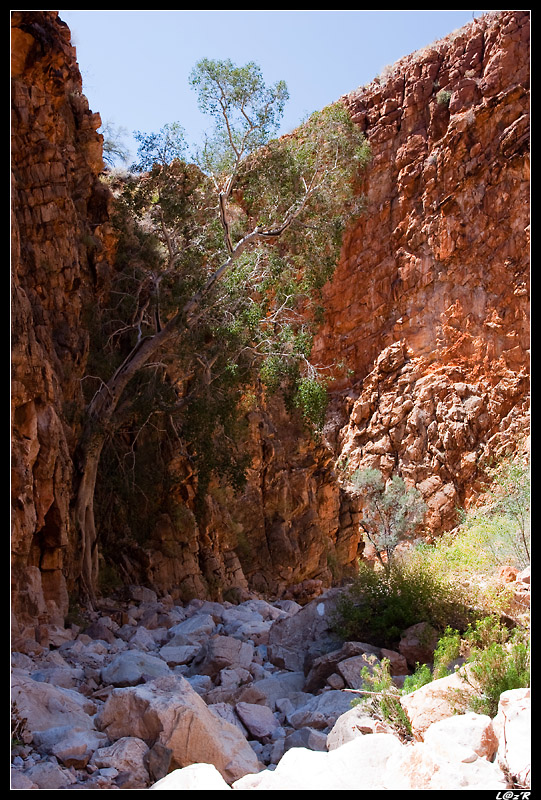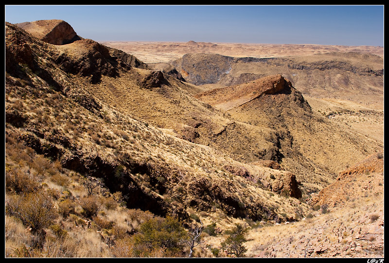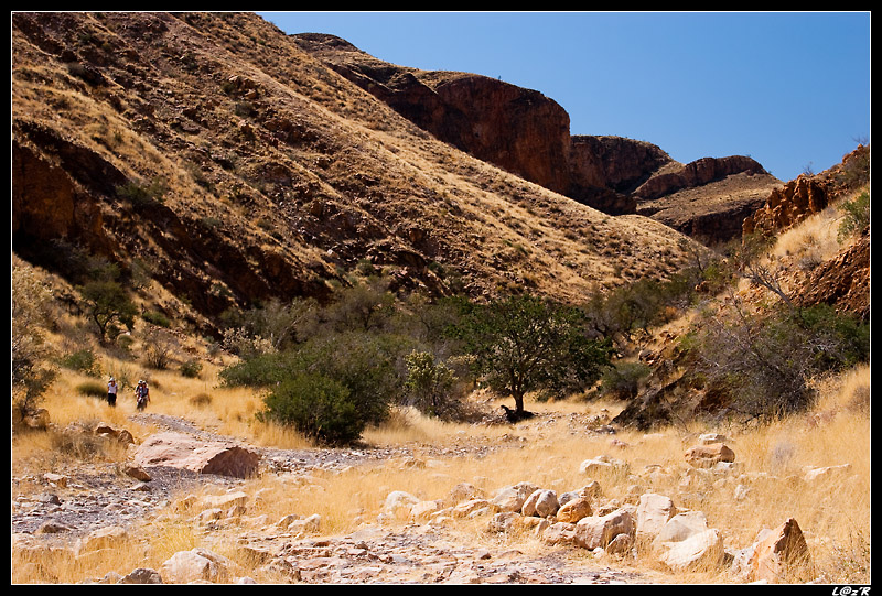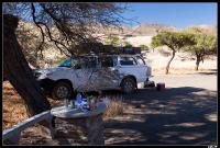 Lever à 6h00 du matin, on range les tentes et on se met en route pour le Naukluft Park. Sur le chemin on croise nos premiers zèbres et un couple de koudous. On arrive à 10h00. On prend un petit déjeuner à l’arrière du 4x4 avant de débuter l’Olive Trail, une randonnée de 10 km. C’est une randonnée donnée pour 4 heures, on la fera en 5. C’est une randonnée assez difficile : durant toute la première heure nous ne faisons que grimper. Nous avons ensuite 10 minutes de plat et tout le reste est de la descente dans un torrent asséché au milieu de caillou de plus en plus gros. Il y aura même un moment où il y a des chaînes pour faire de la via-ferrata. C’est un passage difficile mais on le franchi tous sans encombre mais pas sans peur ! ![]() ![]() Le spectacle là-haut est superbe et dans la descente on trouve des cailloux de toute sortes : noir, bleu ardoise, rose, rouge, bleu, bleu vert, bleu marbré, blanc, marbre vert, marbre rose… et j’en passe ! Il y a des arbres a flan de coteaux, des cactus. On a vu des écureuils, des marmottes et Laurent avec ses yeux de lynx a deviné deux zèbres en haut d’une montagne.
